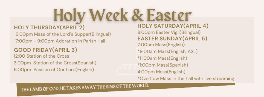 Sunday | 7:00am, 9:00am(with ASL), 11:00am 1:00pm(Spanish Mass), 4:00pm